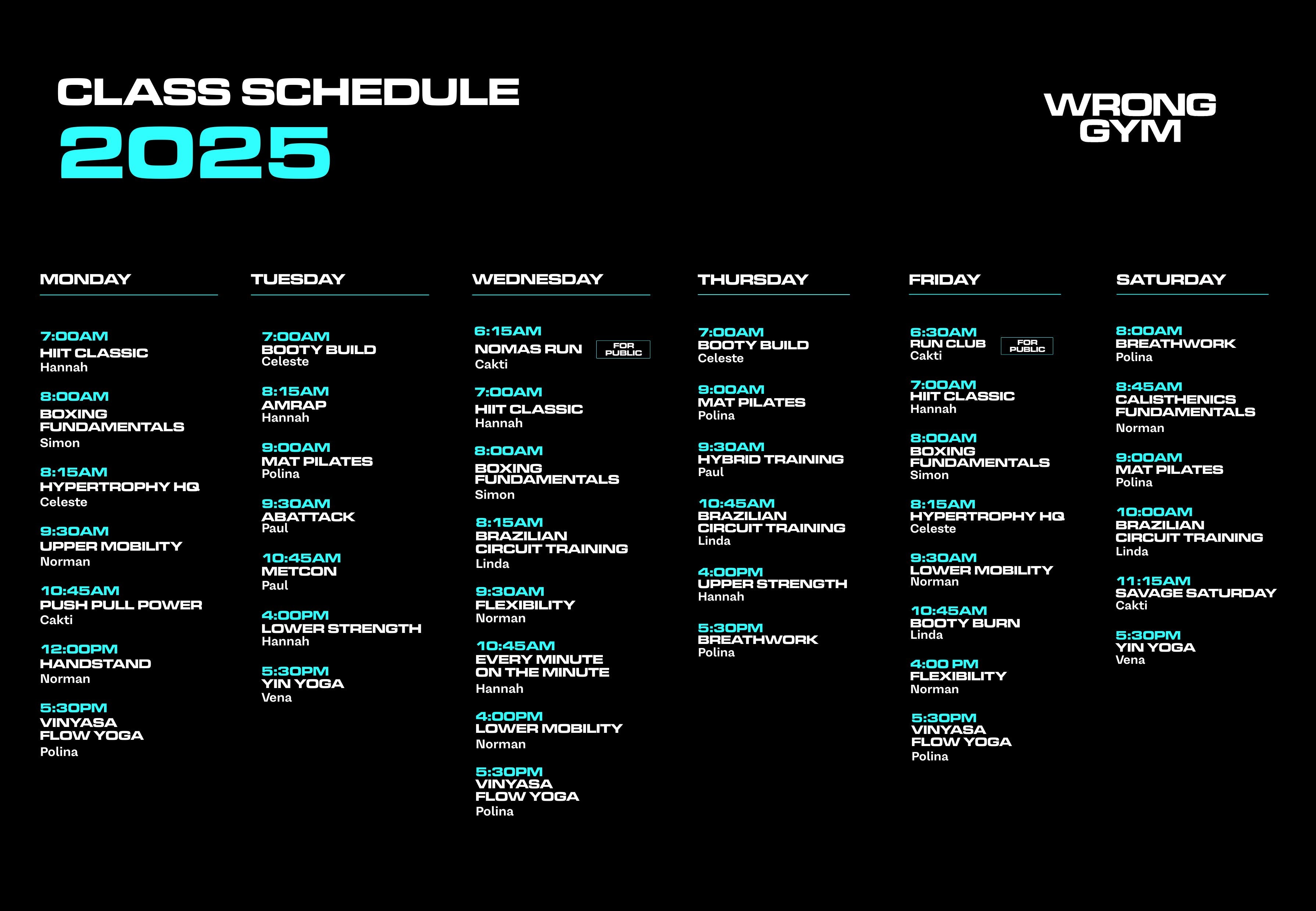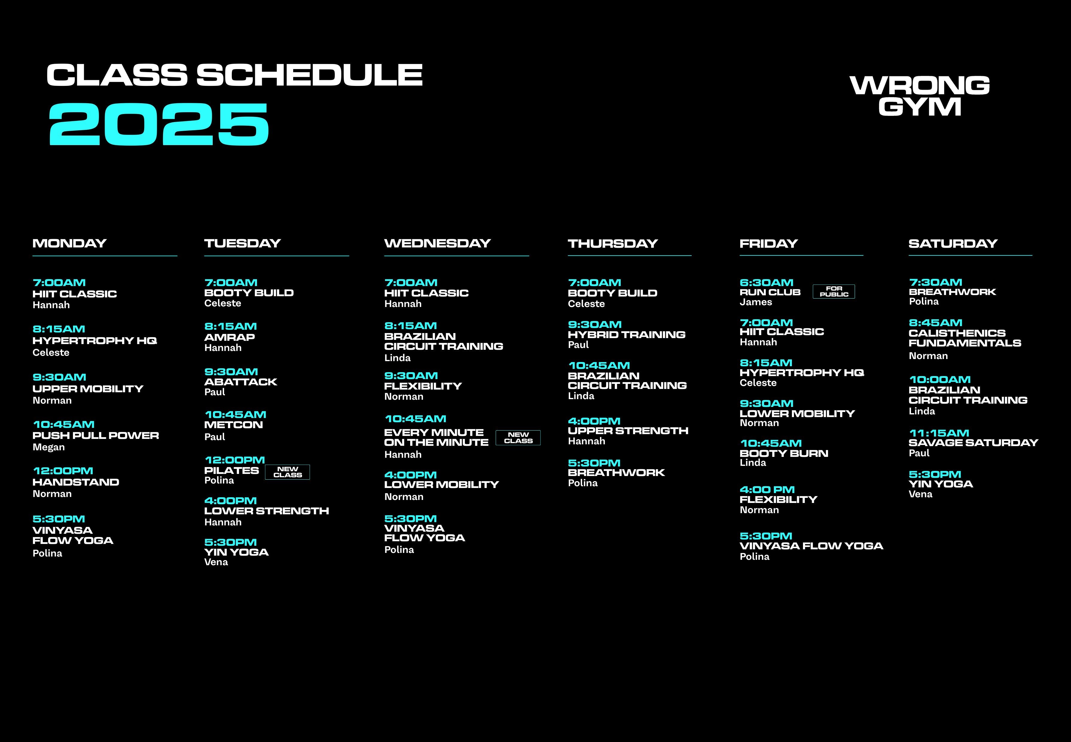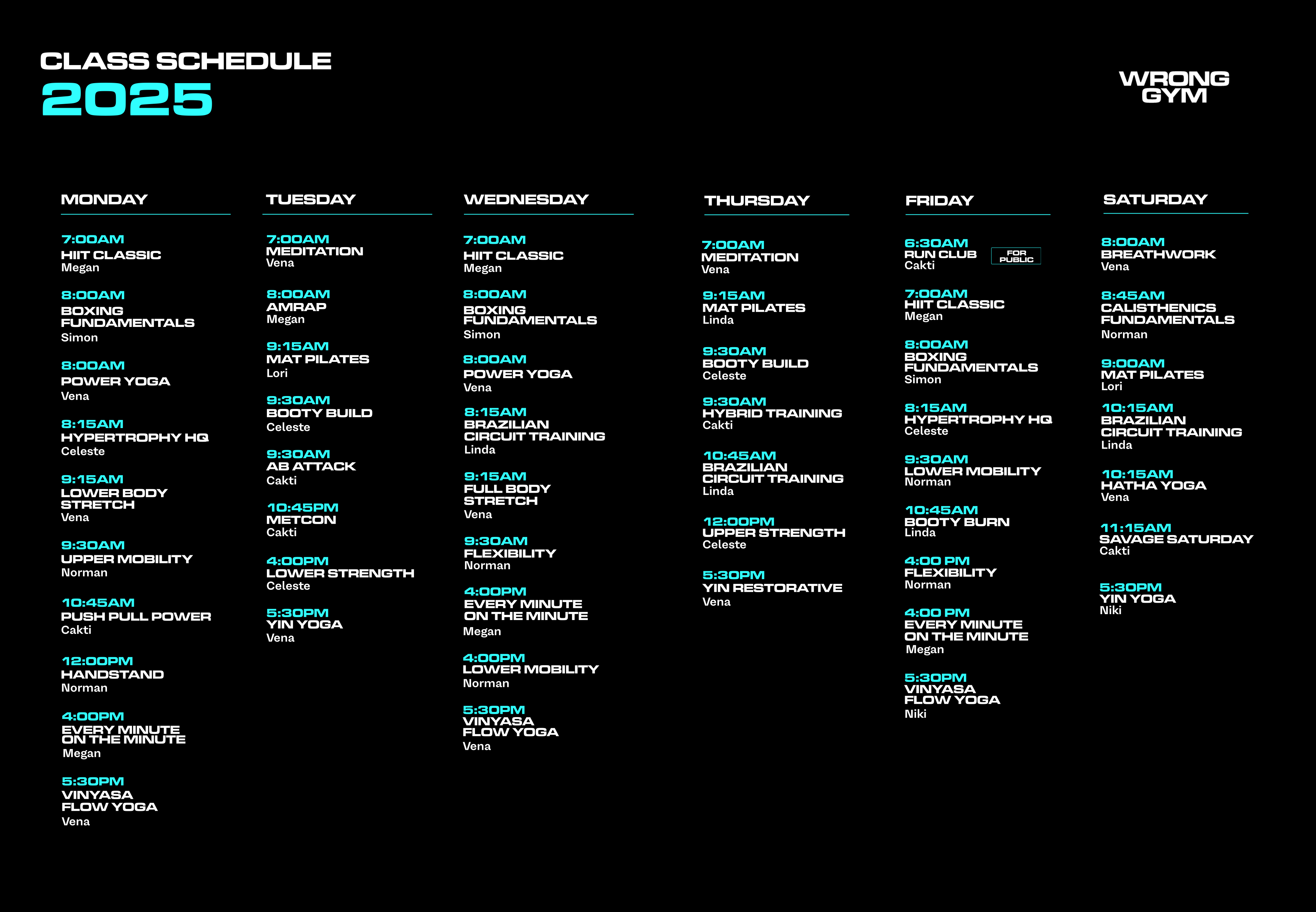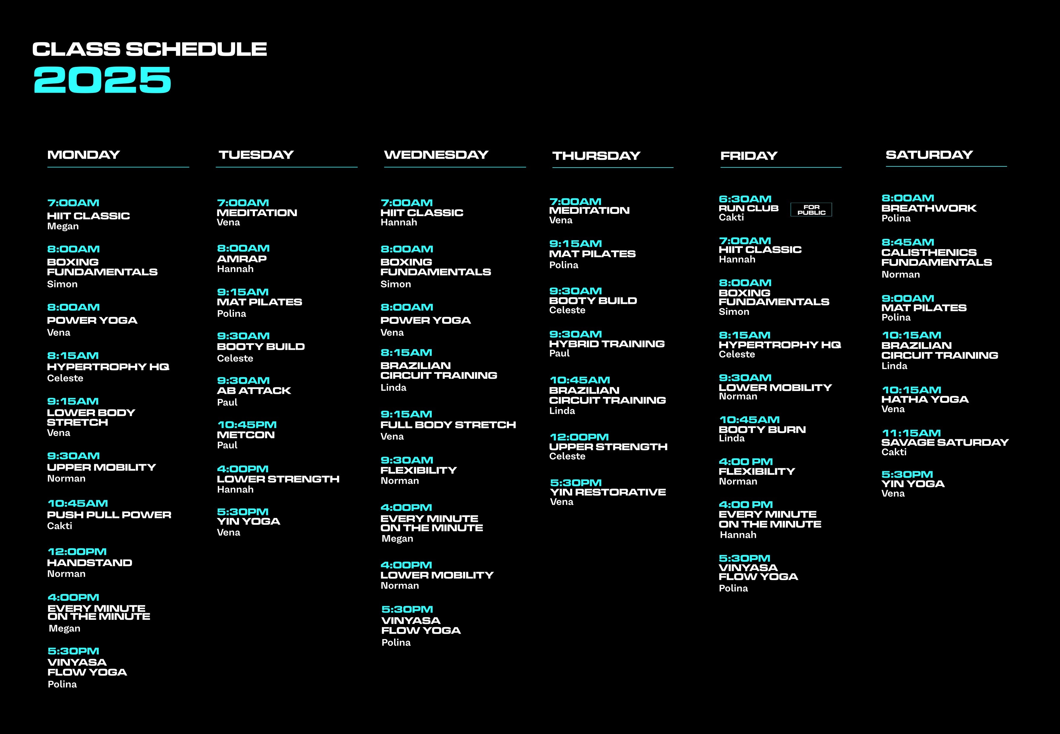 Don’t be. If you’re more than 5 minutes late, your spot may be given away—and the trainer may not let you in. Fair warning: it’s for your safety and out of respect for the class vibe.