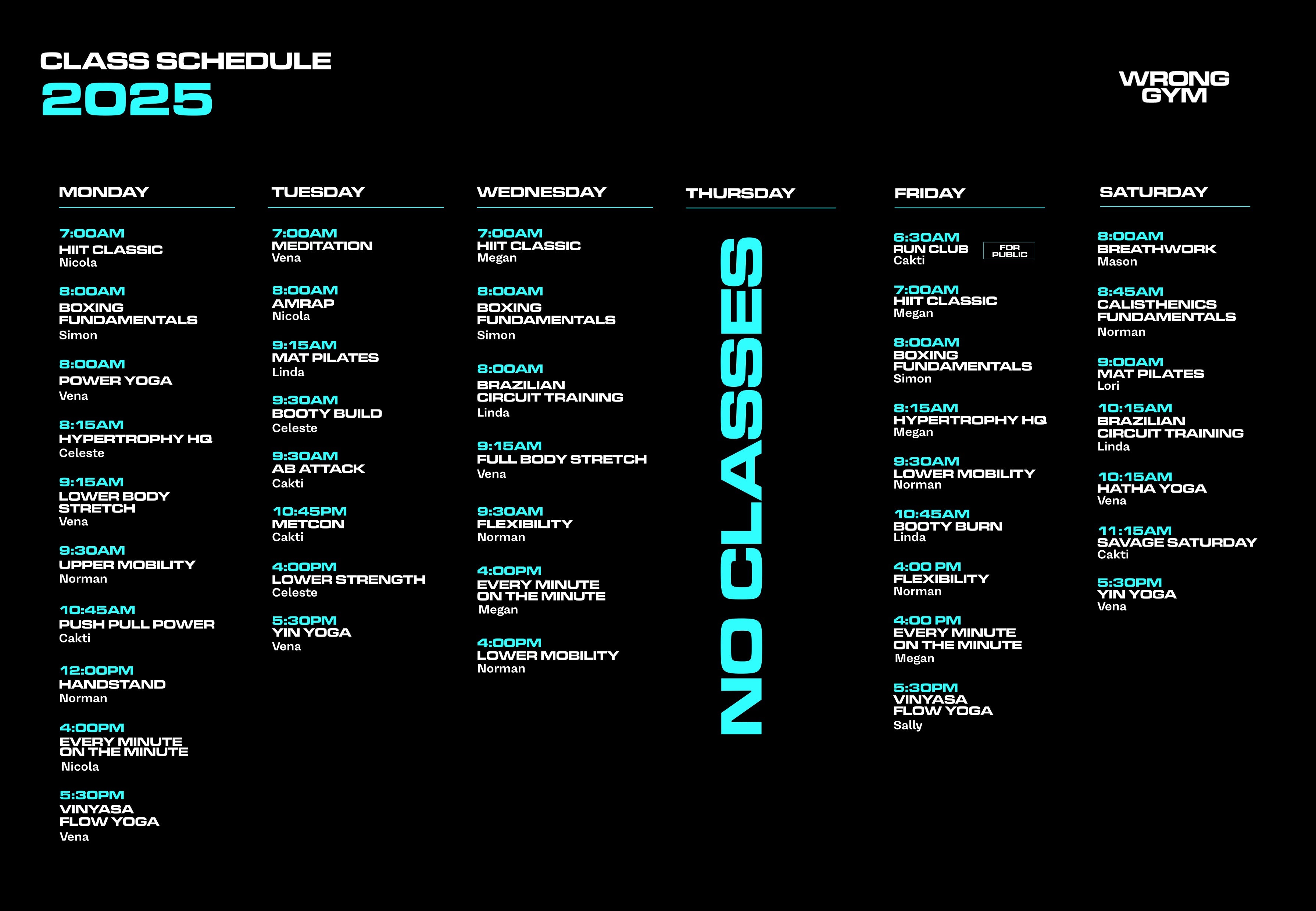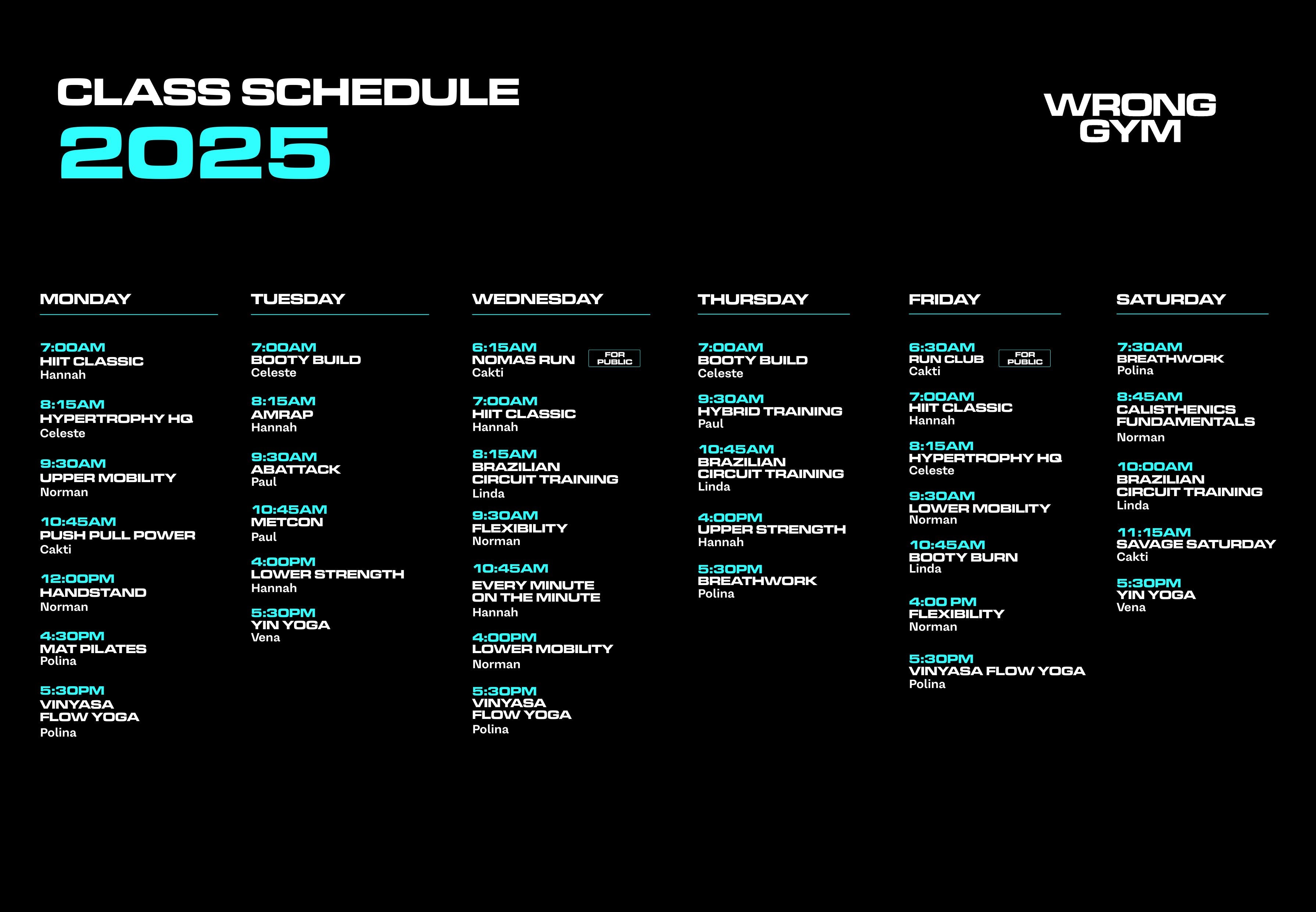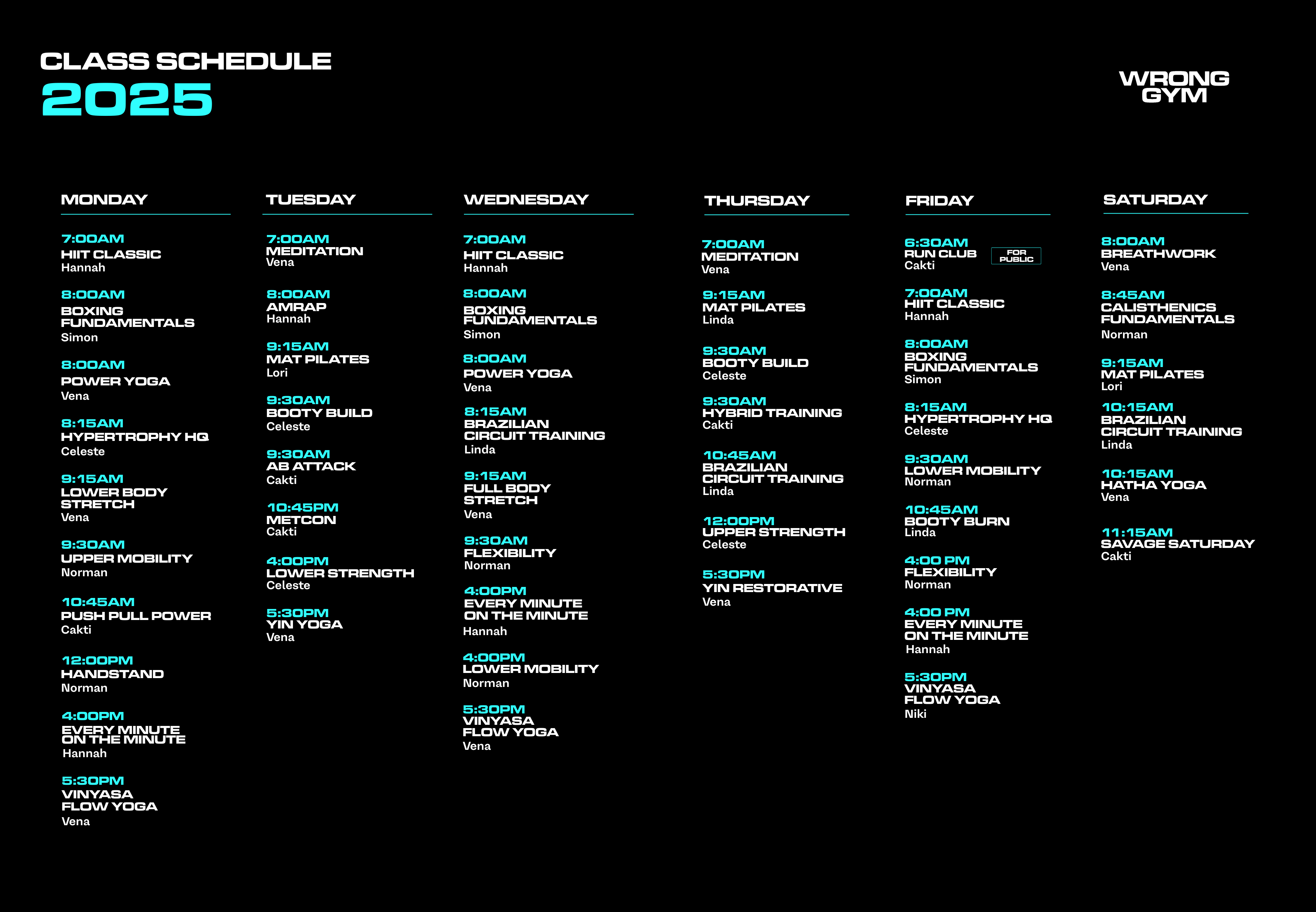 Don’t be. If you’re more than 5 minutes late, your spot may be given away—and the trainer may not let you in. Fair warning: it’s for your safety and out of respect for the class vibe.
